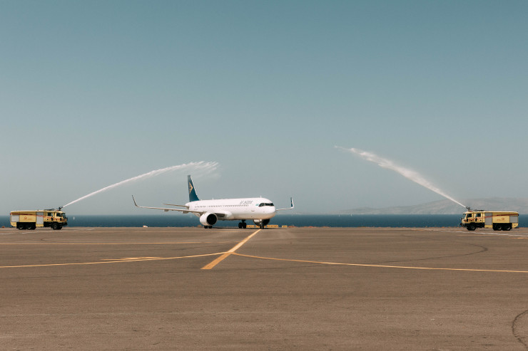 Согласно традиции первый рейс авиакомпании в аэропорт встречали водной аркой, или, как их еще называют, водными салютами.