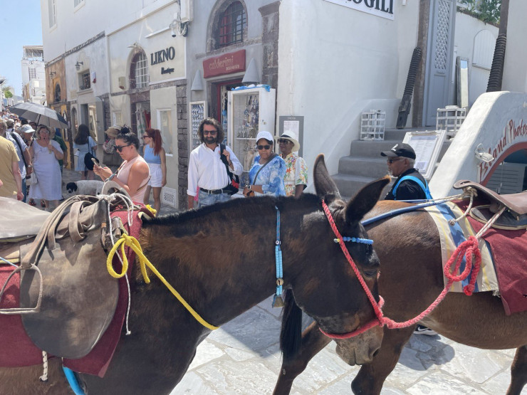 Местные говорят, что на Санторини ослов больше, чем мужчин, церквей больше, чем домов, а вина больше, чем воды. На узких улочках нет места транспорту, поэтому ослики перевозят груз на вершину горы и обратно.