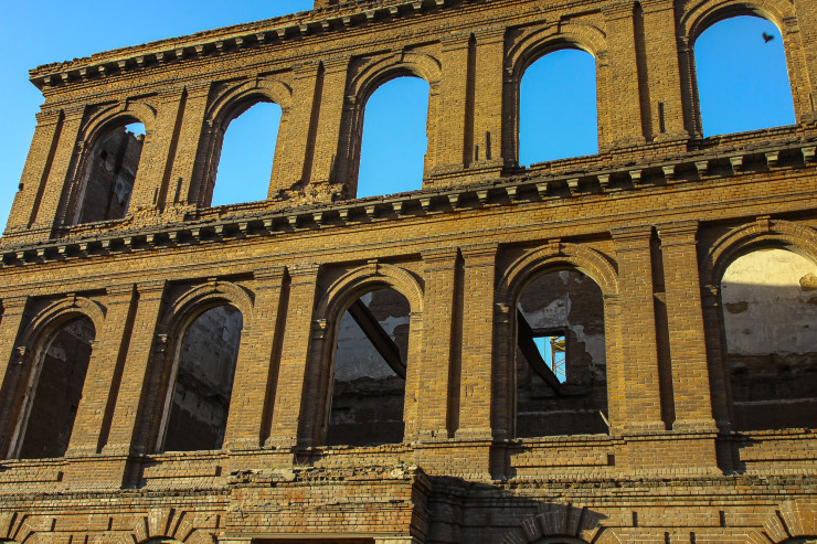 Немало здесь и "сталинских" трехэтажек с кое-где сохранившимися барельефными изображениями: знамена, ленты, серпы и молоты, дубовые гирлянды и снопы пшеницы. Конец 80-х и безвременье 90-х оставили на фасадах шрамы в виде внушительных трещин, отваливающейся штукатурки, разрушенных чердачных надстроек.