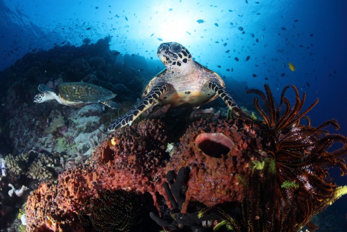 А в другом месте обитают такие же черепахи. Мы их кормили. Пустынное море, голодные местные жители, но тем не менее в одном местечке живут три странные морские подружки. Дайв-гид показал коралл, которым они любят питаться. Мы протягивали коралл, черепахи подплывали, вставали на дно задними лапками, передними поднимались и прикасались к твоей руке, в которой был коралл, откусывали его, а затем отталкивались и подходили к следующему – по очереди, все так же стоя на задних лапках. Тоже буддисты.