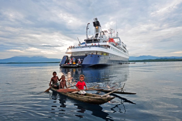Через некоторое время, когда мы были уже на яхте, видим, как американка свешивается с бортика яхты и мажет блеском, выдавливая его из тюбика, губы голеньким детишкам-папуасам, приплывшим на каноэ. Детям интересно посмотреть на нас, бледнолицых, как мы живем на корабле. Им обязательно что-то перепадает: кепка, печенье. Приплывают и взрослые – с папайей, бананами, ананасами. Деньги им не нужны, они обменивают фрукты на рис, мыло и хозяйственные вещи. Команда их знает и предупреждает нас заранее: "Не давайте им денег, они их потеряют". И мы отдаем свои кепки. Папуасы очень дружелюбны и жизнерадостны, все время улыбаются, принимают подарки с удовольствием, трогают наши волосы пальцами, щелкают языком от восторга.
