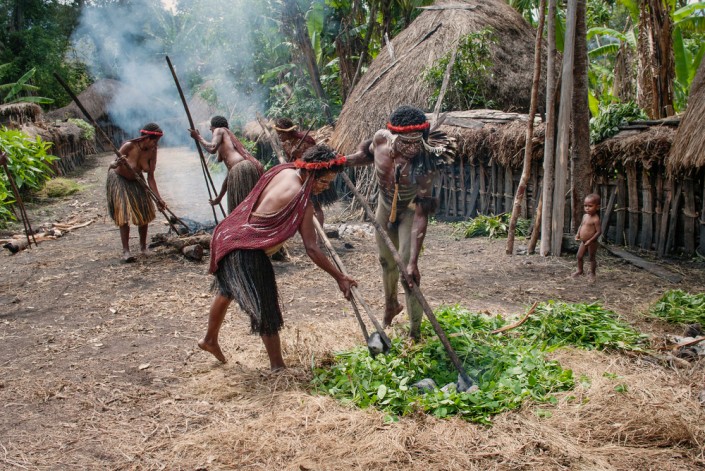 Кроме его дома, есть еще один большой – он принадлежит женщине, коренной жительнице. Раньше она работала в гражданской авиации Папуа, затем вернулась в деревню, построила дом и живет там теперь с мужем. У остальных жителей хижины допотопные, малюсенькие, пальмовые ветки вместо крыши, циновки на полу. Рядом с каждой копошится десяток детей, тут же свиньи – все в одной куче.