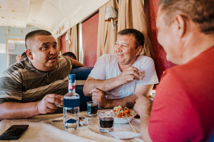 В казахстанских вагонах-ресторанах всегда бушует яркая атмосфера. Вагон наполнен смехом и запахом борща. Официантки приносят одну бутылку водки за другой, в основном для гостей мужского пола.