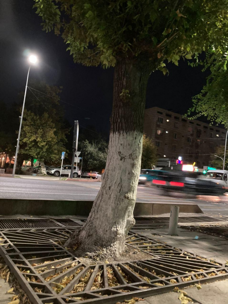 А вот так здесь прокладывают тротуарную плитку, защищая деревья металлическим ограждением.