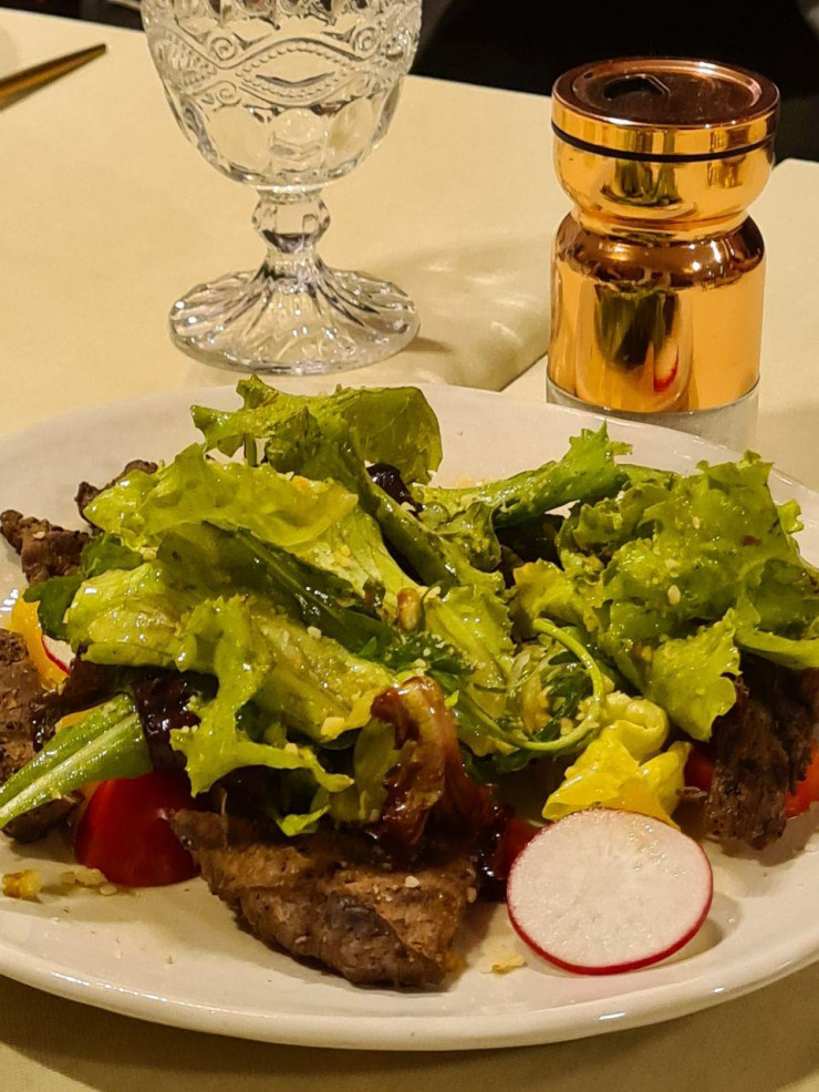 А нам удалось попасть в ресторан национальной кухни "Сандык", где нам провели мастер-класс по приготовлению некоторых экзотических блюд. Например, это, называется борша ет - маринованные говяжьи слайсы под соусом чили.