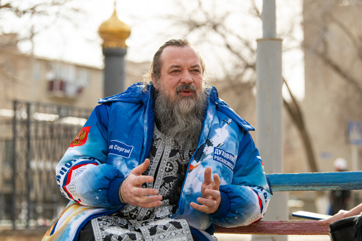На дорогу ушло минут 40. По пути встретили колонну тех самых автобусов, что собрались на площади. Экскурсантов повезли на специальную смотровую площадку в 1 400 метрах от стартового сооружения. А мы в сопровождении духовного лица расположились примерно на такой же дистанции рядом с группой специалистов и людей в форме МЧС России. Среди них заметили второго байконурского священника, отца Сергия. Большой, жизнерадостный и громкий богатырь в подряснике и скуфейке (головной убор). Поверх надета небесно-голубая куртка с ярким принтом - ракетой "Союз" и по-военному маркированная специальной шильдой, на которой стандартным шрифтом значится: "Отец Сергий. Духовник "Роскосмоса".