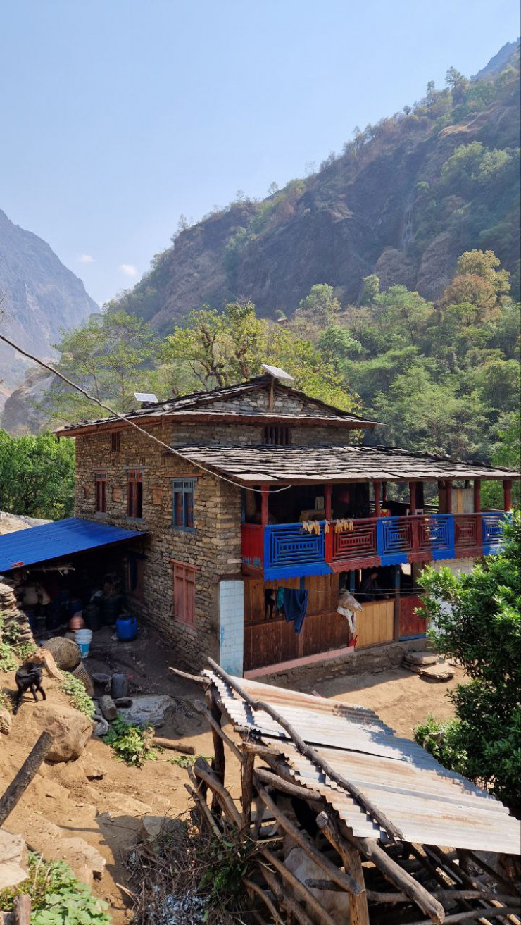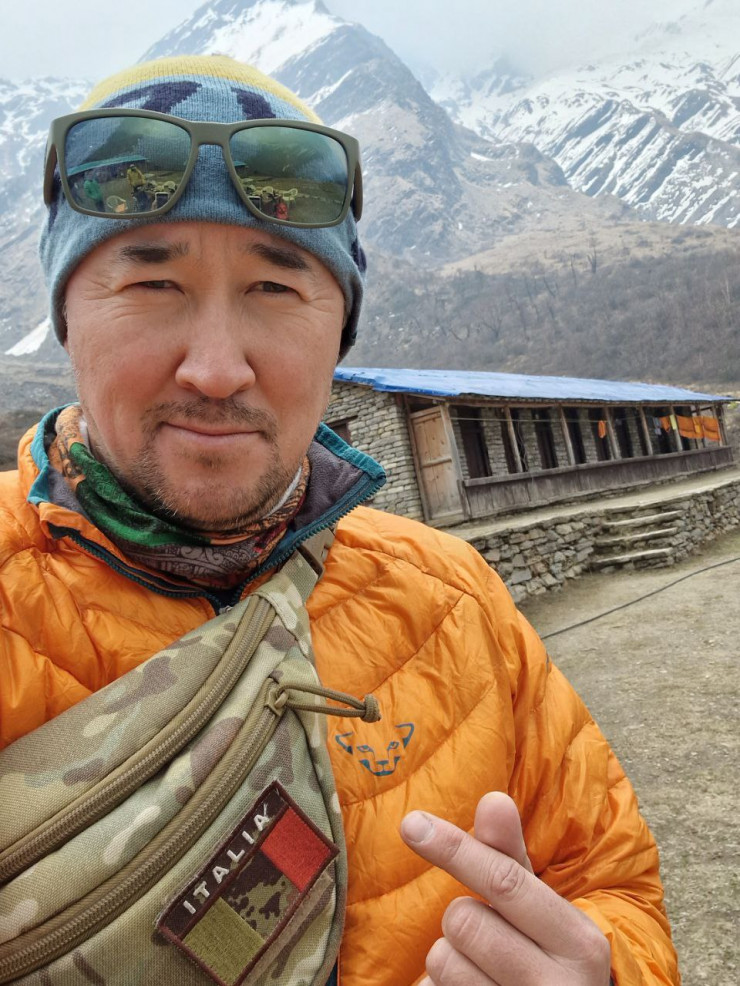 За четыре часа путешественники преодолели 13 километров с перепадом высоты 1300 метров. В итальянском базовом лагере, где они ночевали, стоит одна лоджия с простыми условиями проживания. Электричества для зарядки спутникового терминала нет, но есть грандиозный вид на западную стену пика Дхаулагири.