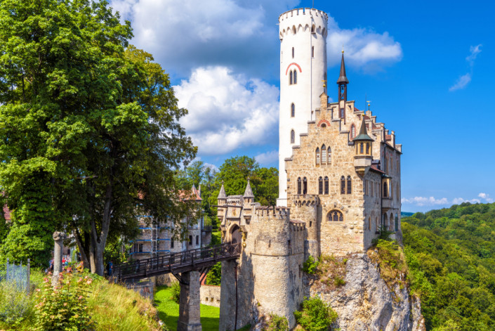 Лихтенштайн. Еще один сказочно красивый замок. Но, в отличие от Нойшванштайна, он служил самой настоящей военной крепостью. Он находится в местечке Хонау, на земле Баден-Вюртемберг, на юго-западе Германии. Первые упоминания о замке датируются XI веком. Много веков крепость принадлежала старинному рыцарскому роду Лихтенштайн. Но от постоянных войн и набегов все-таки не выстояла и была разрушена почти до основания. Долгое время здесь был только один охотничий домик.