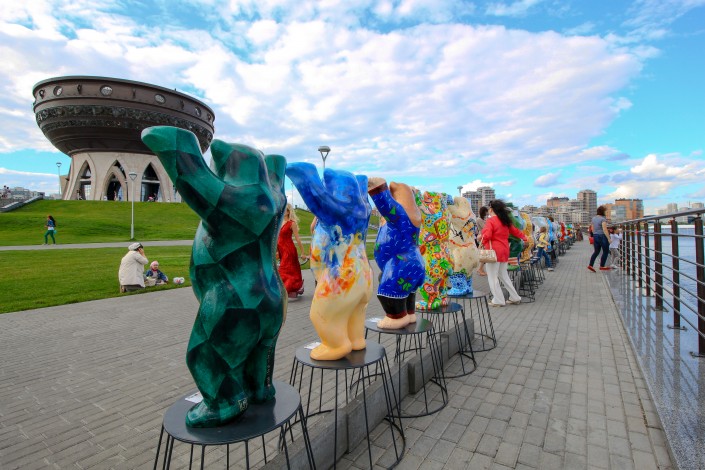 Казахстанский мишка представлен на международной художественной выставке The Minis United Buddy Bears в Казани, сообщает корреспондент Tengrinews.kz.