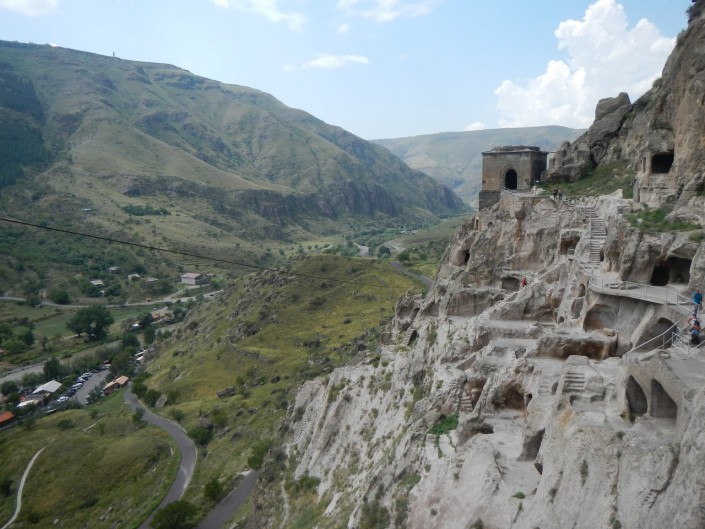 Зрелище, конечно, удивительное: почти отвесная скала высотой метров сто пятьдесят с выдолбленными в ней сотнями ниш, комнат, церквей, часовен, соединенных между собой узкими переходами и уходящими в глубь скалы на 50 метров. Кстати, до сих пор Вардзиа является действующим монастырем с постоянно проживающими здесь монахами в отгороженной от туристов части комплекса.