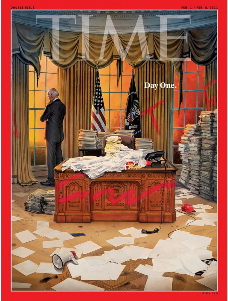 Журнал Time поместил на обложку разгромленный Овальный кабинет в Белом доме, указав на ворох проблем, которые достались Джо Байдену, вступившему в должность президента США, от Дональда Трампа. Иллюстрация опубликована в соцсетях издания, передает Tengrinews.kz