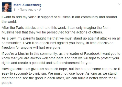 "Я хочу высказаться в поддержку мусульман в нашей стране и во всем мире. Представляю, какое давление испытывают мусульмане после терактов в Париже. Они боятся, что их будут преследовать за действия других. Мои родители-евреи учили меня, что мы должны противостоять нападениям на любое сообщество. Даже если эта атака сегодня направлена не на тебя, однажды ущемление свободы коснется каждого", - написал Цукерберг.
