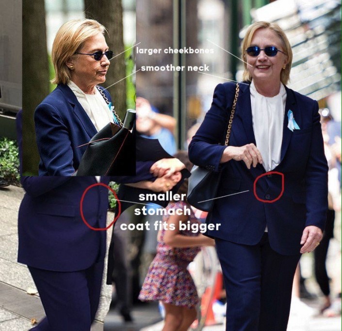 Сторонники теории заговора утверждают, что Клинтон подменили после того, как у нее случился обморок во время траурного мероприятия в Нью-Йорке, посвященного памяти жертв теракта 11 сентября 2001 года.
