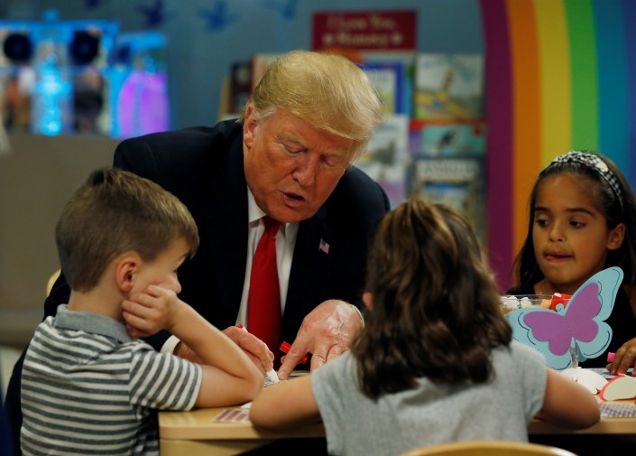 Фотографии визита Трампа в одну из детских больниц Огайо опубликовал в Twitter министр здравоохранения Соединенных Штатов Алекс Азар. Пользователи обратили внимание на снимки, на которых глава Белого дома вместе с детьми раскрашивал государственный флаг. При этом на одном из них видно, как он закрашивает одну из горизонтальных полос синим цветом, хотя они должны быть белыми или красными.