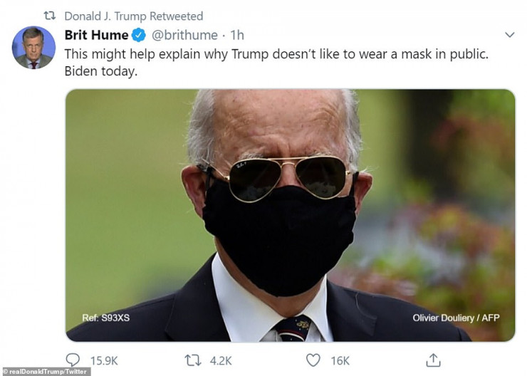 Американский лидер, по-видимому, решил не останавливаться на "успехе" и ретвитнул фотографию Байдена в защитной маске и очках. Фото было запечатлено на церемонии по случаю Дня поминовения, где Трамп также присутствовал, однако он сам отказался надевать маску. Позже репост публикации был удален.