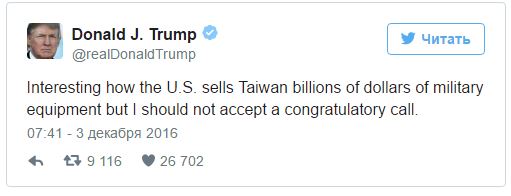 "Интересно, что США продают Тайваню военную технику на миллиарды долларов, а я не должен принимать поздравительный звонок", - написал политик в "Твиттере".