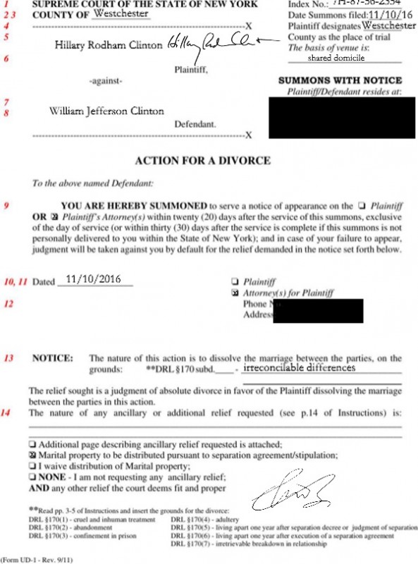 "Примерно в 9.18 утра в четверг адвокаты Хиллари Клинтон подали иск о разводе в Верховный суд  штата Нью-Йорк для округа Уэстчестер", - пишет издание. В качестве доказательства газета опубликовала фотографию иска.