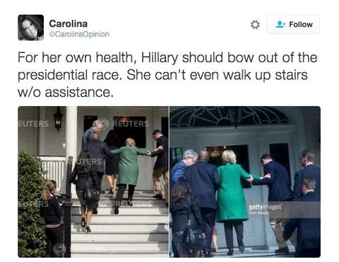А недавно состоянием здоровья бывшей первой леди США озаботились пользователи социальных сетей. Причиной стали распространившиеся в Интернете фотографии, на которых видно, как несколько мужчин помогают Клинтон подняться по лестнице.