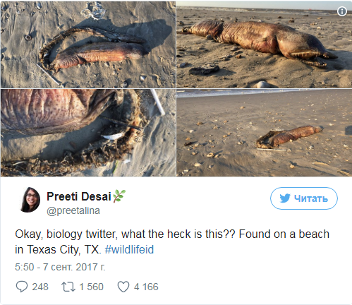 После урагана "Харви" на пляже в американском штате Техас обнаружили загадочного морского обитателя с острыми зубами. Его фотографии разместила в своем Twitter биолог Прити Десай, сообщает Lenta.ru.