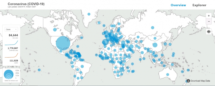 Согласно сводке Всемирной организации здравоохранения, общее количество заражений COVID-19 в мире превысило 1,773 миллиона человек, скончались 111 652 человека. За сутки заболели 76 498 человек, скончались 5702 человека.