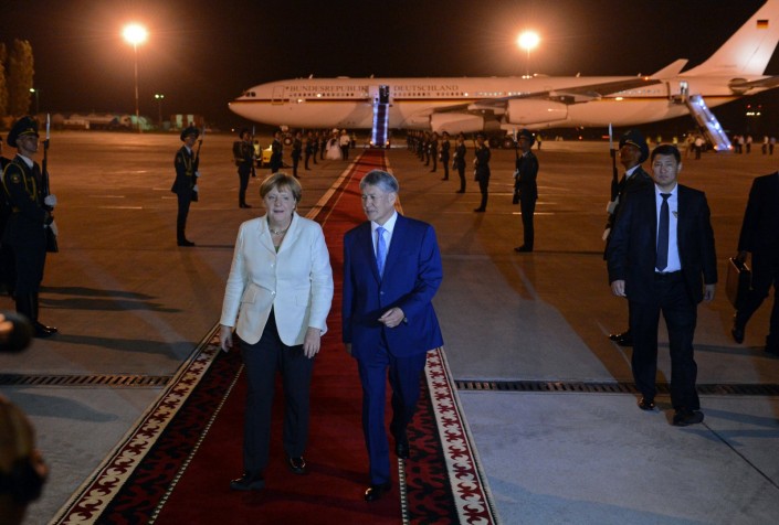 Федеральный канцлер Германии Ангела Меркель впервые прибыла в Кыргызстан с официальным визитом, передает Tengrinews.kz со ссылкой на пресс-службу президента КР. В международном аэропорту "Манас" ее встретил президент Кыргызстана Алмазбек Атамбаев.