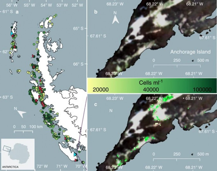 Ученые университета Кэмбриджа и британской Антарктической службы выявили почти 1700 очагов цветения водорослей на примерно двух квадратных километрах. Водоросли встречаются чаще у мест обитания пингвинов и птиц.