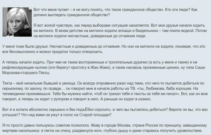 В публикации от 2010 года Любимова размышляла о том, как должно выглядеть гражданское общество. "Вот я и хотела абсолютно серьезно и без под**бки спросить: а чего вы пытаетесь добиться? Верите ли вы, что вас услышат? Что над вами не ржут в голос на Старой площади? Я-то просто давно пользуюсь советом психолога. Живу в городе Москва, стране России по принципу, завещанному жертвам насильника: я легла на спину, раздвинула ноги, глубоко дышу и даже стараюсь получить удовольствие", - писала она.