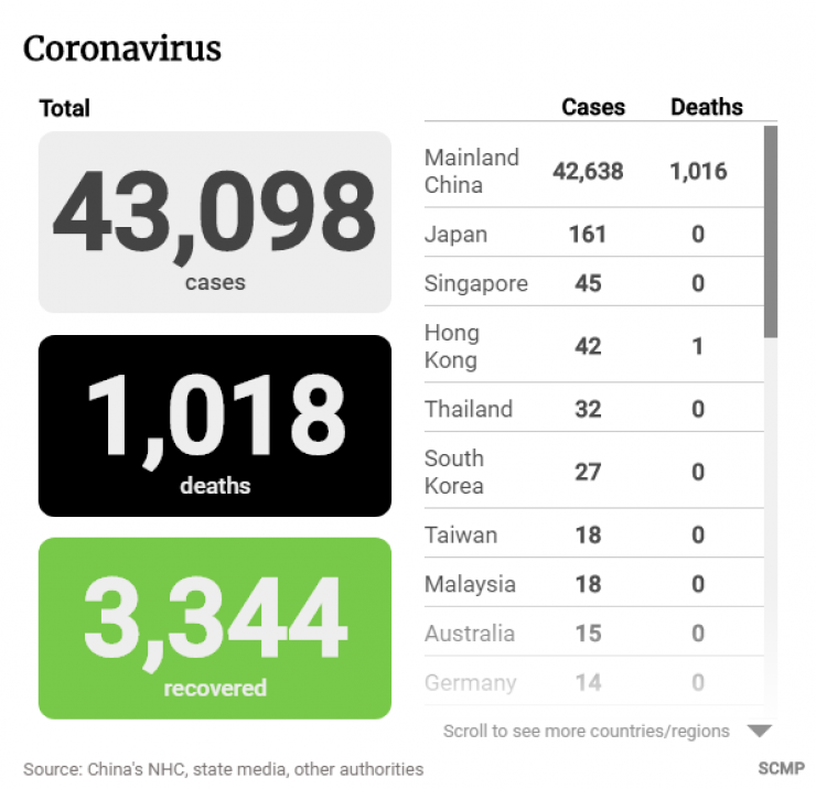 По состоянию на утро 11 февраля количество подтвержденных случаев нового типа коронавируса в целом по Китаю превысило 43 тысячи человек, скончались 1018 человек, выздоровели и выписаны из больниц 3344 пациента. Об этом сообщает South China Morning Post со ссылкой на органы здравоохранения Китая.