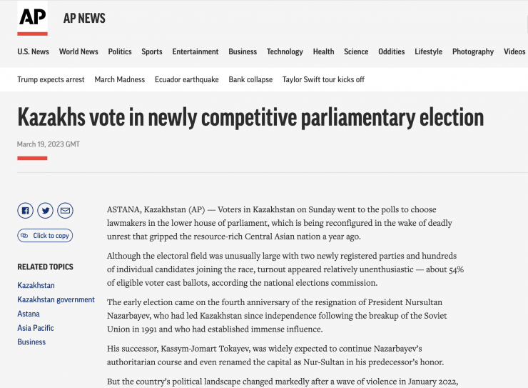 В агентстве AP News выпустили статью под заголовком "Казахстанцы голосуют на новых конкурентных парламентских выборах".