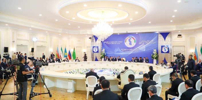 После церемоний в фойе президенты уселись за большой круглый стол. Начал на правах хозяина Президент Казахстана. После слова предоставлялись по алфавиту. Все лидеры максимально придерживались заготовленных речей. Азербайджанский президент говорил о добыче нефти, экологии и вспомнил конфликт с Арменией. Иранский президент, как и посол Бородавкин, говорил о запрете на чужие корабли и военные базы в Каспийском регионе. Российский - вспомнил о туризме и назвал саммит даже не историческим, а эпохальным. А еще несколько раз поблагодарил Казахстан. Туркменистанский лидер сказал, что обсуждать сотрудничество надо чаще, и сразу же предложил свою страну в качестве следующего места сбора.