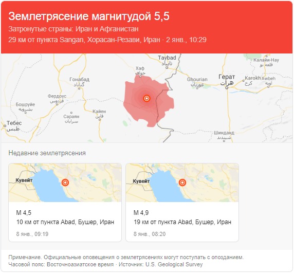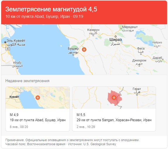 Второе землетрясение магнитудой 4,5 произошло в 3:19 по времени UTC (9:19 по времени Нур-Султана). Эпицентр располагался в 17 километрах к юго-востоку от города Боразджан, очаг также залегал на глубине 10 километров.