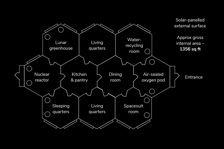 Предполагается, что дома будут иметь внешнюю поверхность, обшитую солнечными панелями, а также герметичную кислородную капсулу, являющуюся частью входа, комнату для рециркуляции воды, лунную оранжерею и ядерный реактор. Остальную площадь займут жилые и спальные помещения, столовая и кухня, а также комната для скафандров.