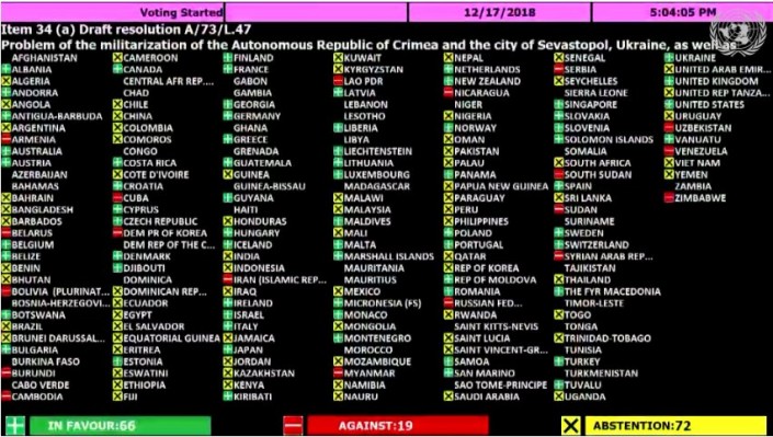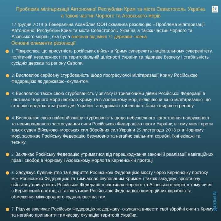 Резолюция призывает прекратить незаконную оккупацию украинской территории. Также она осуждает наращивание военного присутствия России в Черном и Азовском морях и препятствование судоходству. Документ поддержали 66 стран, 19 государств проголосовали против, 72 воздержались.