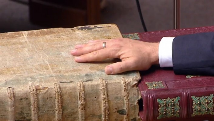 13.19 Зеленский, положив руку на конституцию Украины и Пересопницкое Евангелие (рукописный памятник искусства XVI века), приносит присягу.