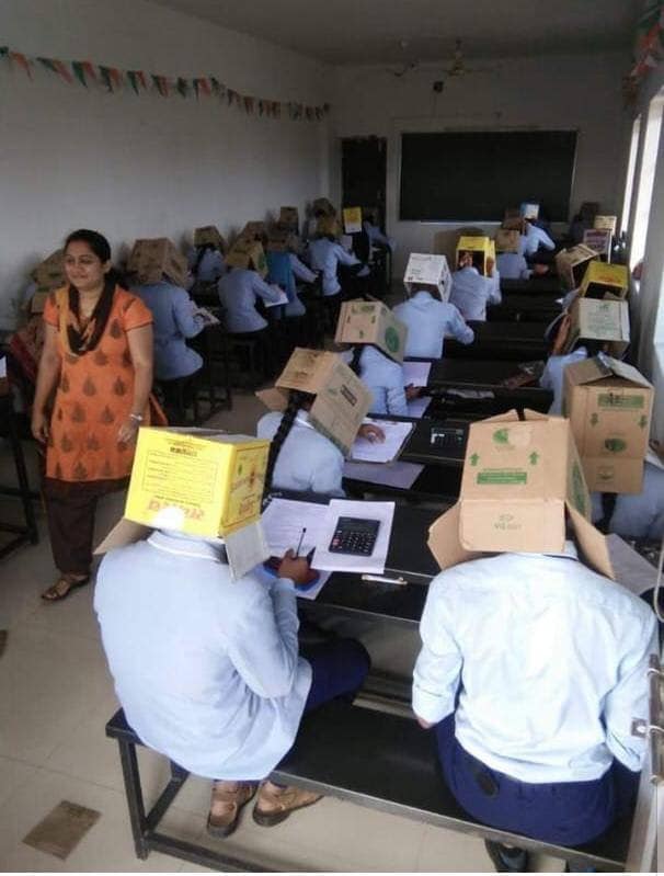 Индийским студентам на время экзамена надели на головы картонные коробки. В Сети появились фото, быстро ставшие вирусными, передает Tengrinews.kz.