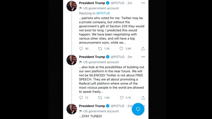 Мұны Трамптың өзі 2021 жылдың қаңтарында растаған еді. Ол Twitter-де персоналды желілері бұғатталғаннан кейін пост жазады, бірақ Twitter әкімшілігі жазбаны бірден өшіріп тастады. Десе де, бірқатар БАҚ хабарламаны скриндеп алды.