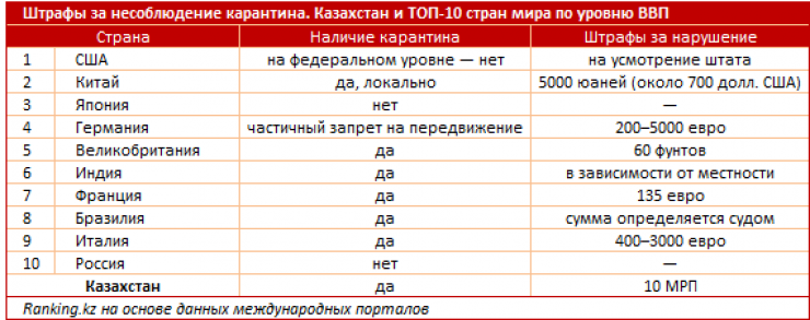 В Казахстане за нарушение карантина могут оштрафовать на 10 МРП (26,51 тысячи тенге) или арестовать на 15 суток. Эти меры выглядят не такими строгими, как в некоторых странах мира. Специалисты Ranking.kz выяснили, где нарушителей избивают палками и даже казнят, передает Tengrinews.kz.