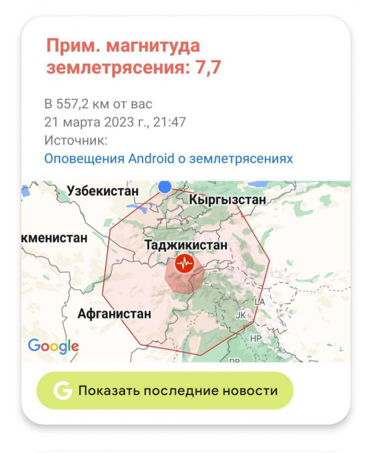 В Узбекистане пользователи Android-смартфонов получили оповещение о мощном землетрясении за 1-2 минуты до того, как сейсмическая волна достигла территории республики, сообщает Tengrinews.kz со ссылкой на Газету.uz.