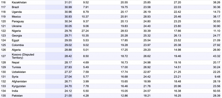 Казахстан в рейтинге находится на 116-м месте из 135 стран. Среди дешевых стран также оказались Узбекистан (130-е место), Кыргызстан (133), Афганистан (132), и замыкает рейтинг Пакистан.
