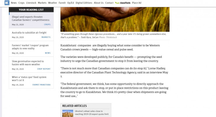 "Казахстанские компании незаконно покупают то, что некоторые считают "королевскими драгоценностями" Западной Канады, – высококачественные зерновые и бобовые семена. Данные сорта были разработаны исключительно в интересах Канады, в связи с чем участники семеноводческой индустрии требуют от федеральных властей Канады запретить вывоз семян из страны", - пишет по этому поводу аграрный сайт Manitobacooperator.ca.