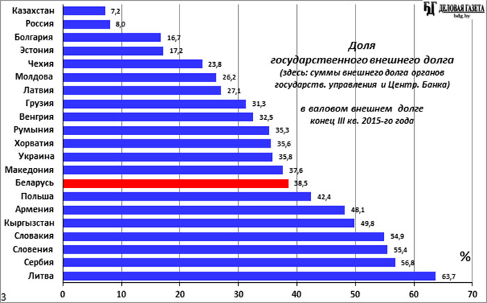 Этот показатель в Казахстане составляет 5,3 процента. У России этот показатель лучше - 3,2 процента. Самые большие проценты - у Словении - по причине большого внешнего госдолга и у Украины по причине маленького ВВП.