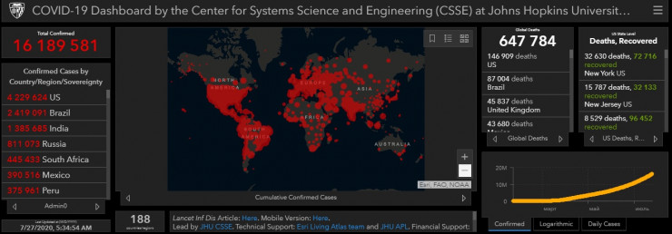По данным университета, в мире COVID-19 заболел 16 189 581 человек, жертвами инфекции стали 647 784 пациента, еще 9 344 883 человека выздоровели.