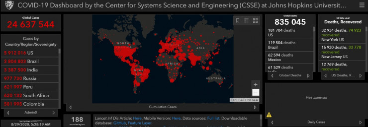 По данным университета, в мире COVID-19 заболели 24 637 544 человека, жертвами инфекции стали 835 045 пациентов, еще 16 107 859 человек выздоровели.