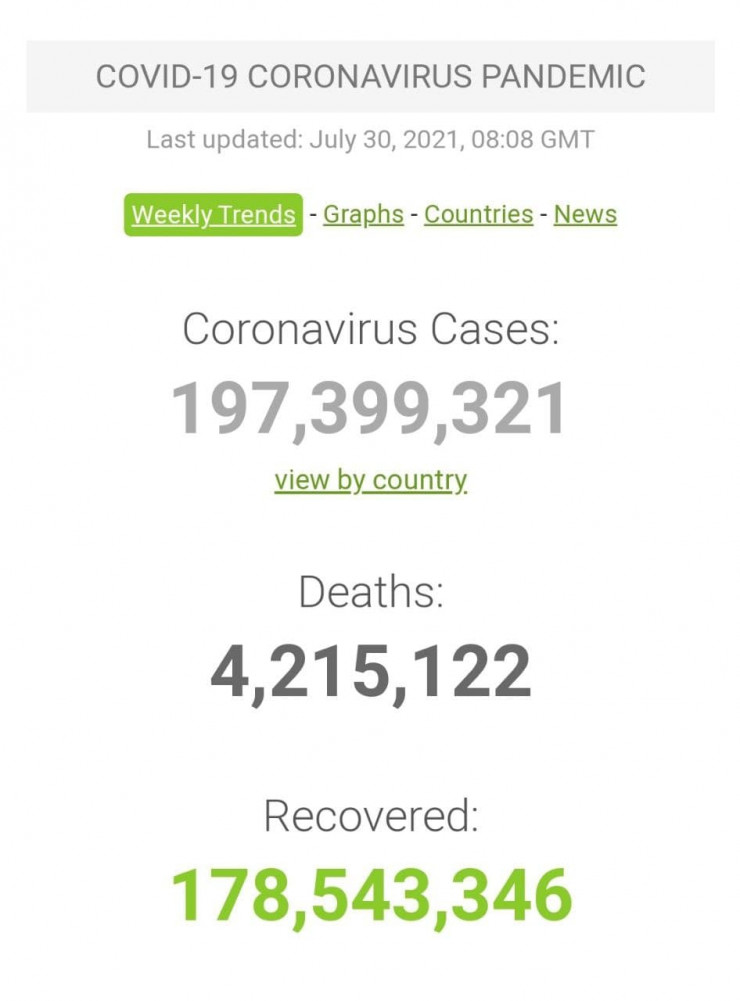 Информация Worldometers опережает данные других порталов. К примеру, на сайте Университета Джонса Хопкинса сообщается о 196 628 018 случаях заражения коронавирусом.
