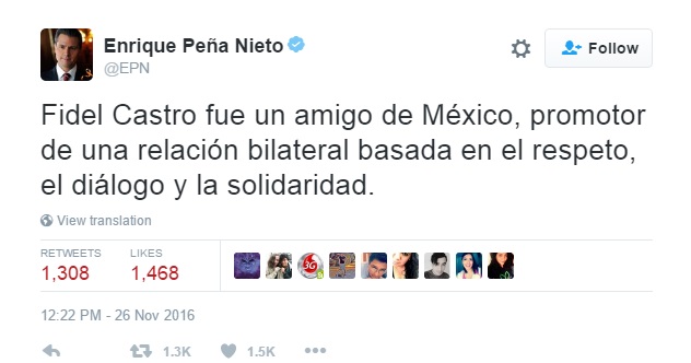 "Фидель Кастро был другом Мексики, он способствовал отношениям, построенным на доверии, диалоге и солидарности. Я сожалею о смерти Фиделя Кастро, лидера кубинской революции, символа 20 века", - написал президент Мексики Энрике Пенья Ньето в своем микроблоге в Twitter.