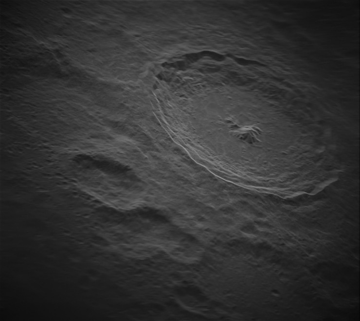 На снимке виден кратер Тихо. В Национальной радиоастрономической обсерватории (NRAO) указали, что, хотя фото сделано с расстояния в сотни тысяч километров, возникает ощущение, будто зритель летит прямо над поверхностью спутника. Разрешение полученного изображения составляет пять на пять метров и содержит примерно 1,4 миллиарда пикселей.