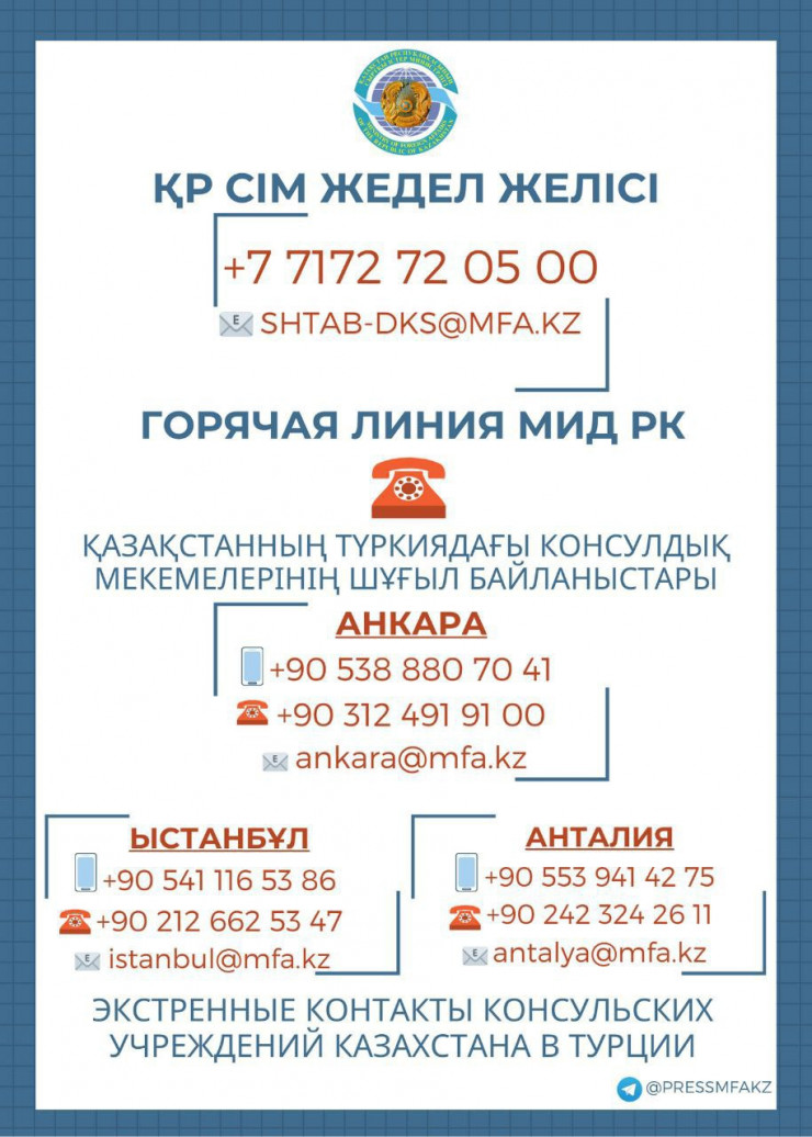 "МИД открыта горячая линия по номеру 8 (7172) 72-05-00, по которому наши граждане и их родные могут обратиться за помощью. Кроме того, в ближайшее время будут опубликованы экстренные контакты загранучреждений в Турции.