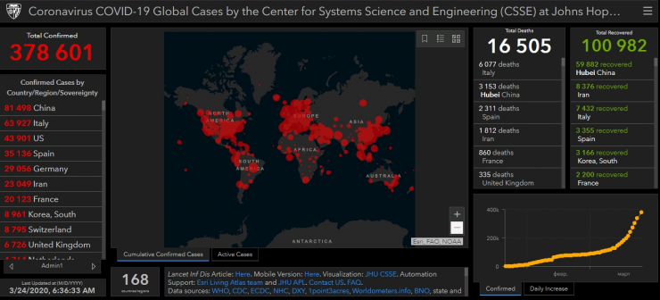 Между тем, по информации исследователей американского университета Джона Хопкинса, по состоянию на утро 24 марта число заразившихся COVID-19 превысило 378 тысяч, летальных исходов более 16,5 тысячи, выздоровевших - 100 982.
