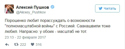 Заявления Порошенко в своем Twitter прокомментировал член Совета Федерации Алексей Пушков. Сенатор отметил, что у украинского лидера не тот масштаб.