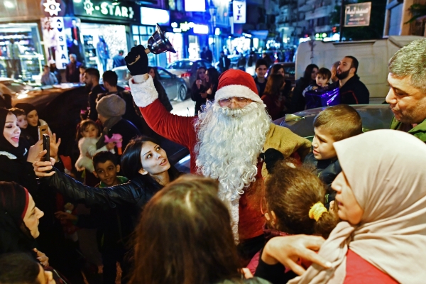 Рождество также празднуют в Сирии. На фотографии ниже жители города Латакия позируют с мужчиной в костюме Санта-Клауса.